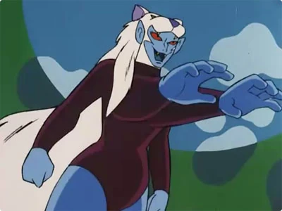 Breast Claw resembles a young woman with a slender body, blue skin, a maroon leotard, a white panther-like headdress with hair that goes down from the back, and a pair of arms that extend from her breast area.