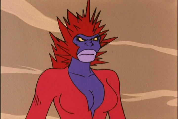 Coral Claw is a purple skinned humanoid in a red jumpsuit with spikes going down her head covering her head and neck, with a big lavender colored mouth.