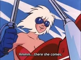 They appear as a pair of twins one riding a chopper motorcycle the other In the passenger seat welding a machine gun they also appear to wear goggles with blue lenses, tight black pants, blue gloves, red bikini tops and white hair covering the top of their heads and around their faces.
